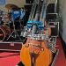 This photograph thrives on contrasts: the artificial chill of the drink cooler against the tungsten warmth of the coin-operated relic, the corporate gloss of branded red against the creeping darkness of a closed café. In the far right, upturned chairs signal the absence of patrons; the day’s commerce is over. The glass counter on the left catches faint reflections of the fridge, pulling the light deeper into the shadows.