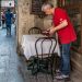 Technically, the photograph is well-judged. The deep reds of the car’s paint are rich without being over-saturated, and the chrome details hold their highlights without blowing out. The colour palette is unexpectedly bold—red car, orange barriers, varied clothing tones in the crowd—yet it all balances thanks to the neutral stone of the piazza and the muted signage above. Sharpness is consistent across the frame, keeping both the car’s fine details and the background context intact.