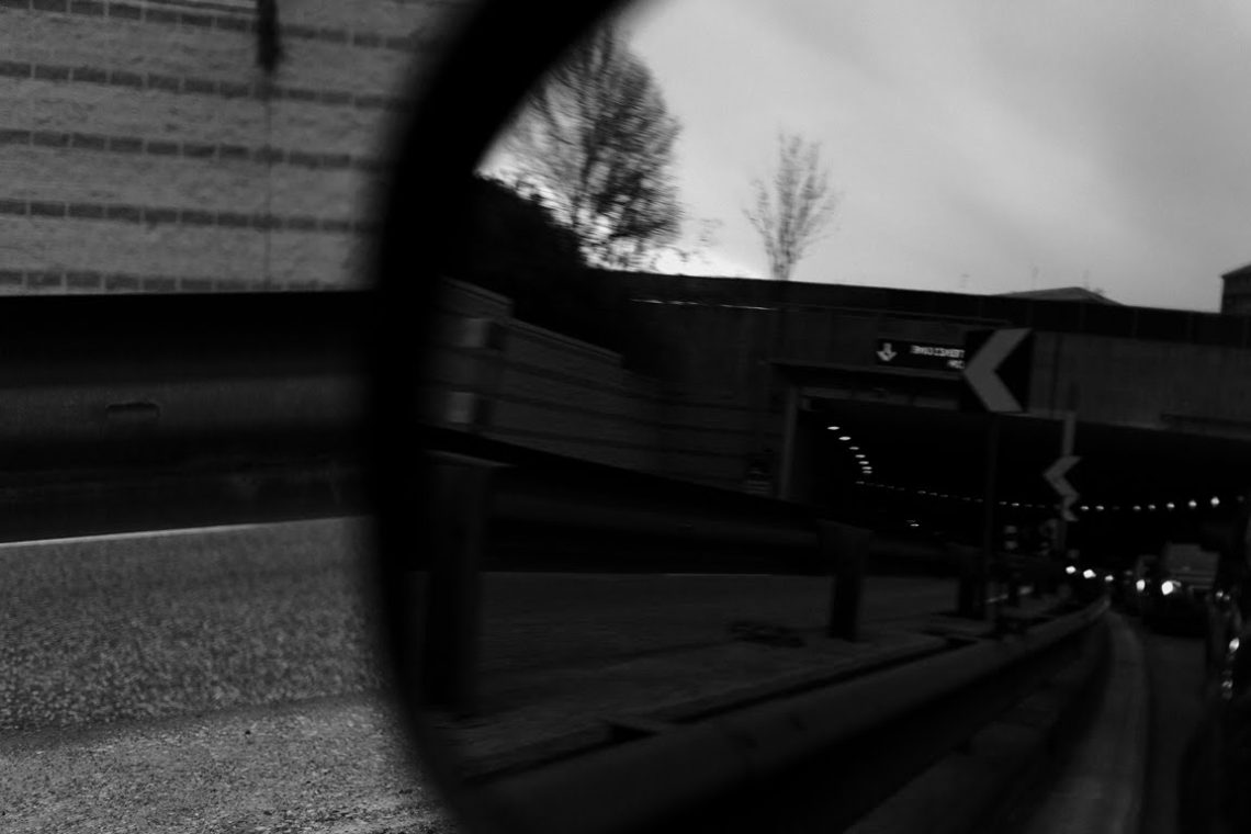 This photograph was taken in the last leg of a trip to Rome, from inside my car while standing still because one of the many and usual traffic jam on the Tangenziale. I tried to have the road not to dominate the frame, fragmenting it, instead. A dark curve cuts through the image, separating two visual registers: the solid, static wall on the left and the receding tunnel of lights on the right. The image is less about travel than about perception while travelling. The motion blur and softness at the edges weren’t deliberate; they happened by chance. However, I like the result nonetheless. The photo would have felt dishonest…