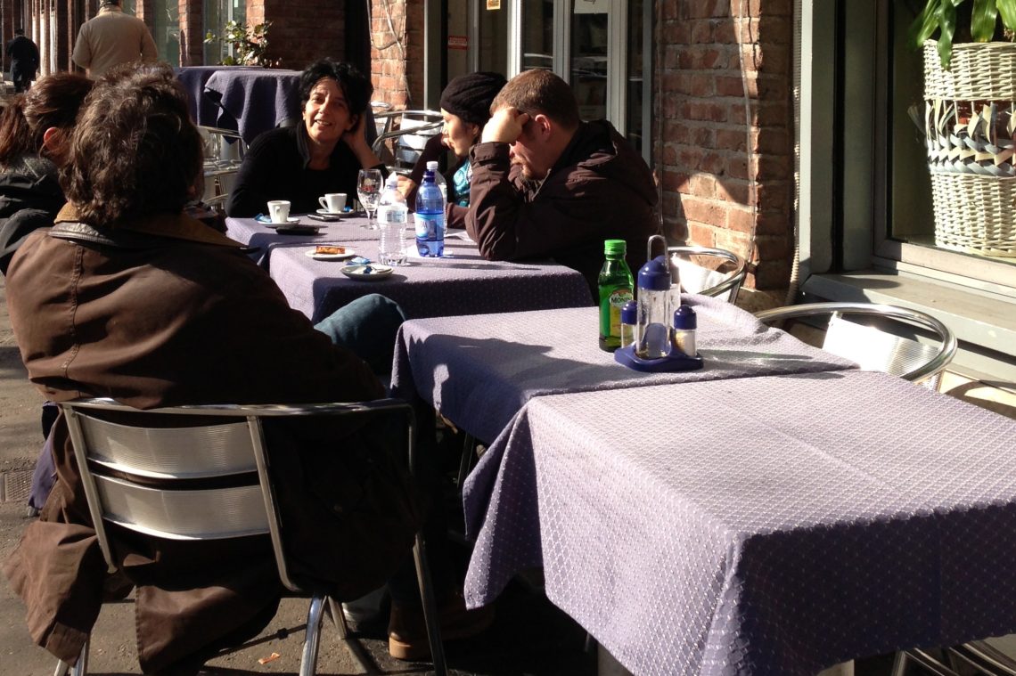 The group gathered around the table, half in shadow, half in sunlight is a familiar Roman scene: conversation, coffee, and the kind of pause that feels both ordinary and essential.